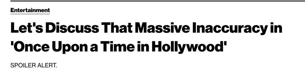My favorite quote from this reading was: “Cinema not only has the power to reframe myth, but to rewrite history: it brings back Sharon Tate. Manson longed for fame, and the film denies him this. The film doesn’t deliver its revenge exclusively via violence. It demythologizes Charles Manson, reduces him to a cameo, exposes the Manson Family as inept, and makes Sharon Tate the story’s beating heart. It gives Sharon a cinematic legacy that transcends her murder.” The ending of this movie was so powerful that it’s hard to put into words the sort of emotion it evokes. As brutal and unsettling as it may be to watch, the ending serves to bring a certain sort of justice to the Manson family murder case by taking its legacy and the horror that Manson so desperately wanted remembered and essentially writing him out of the story, while also preserving the memory of Sharon Tate and all of the lives lost. Tarantino rewrites history in a way that honor’s Sharon Tate’s legacy, honors this era of Hollywood and everything that it stood for, and ultimately reinforces this idea of the importance of redemption and preservation.